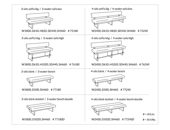 - Cobo soffor och bänkar tillverkas som standard i två bredder: 1800 mm och 2400 mm.